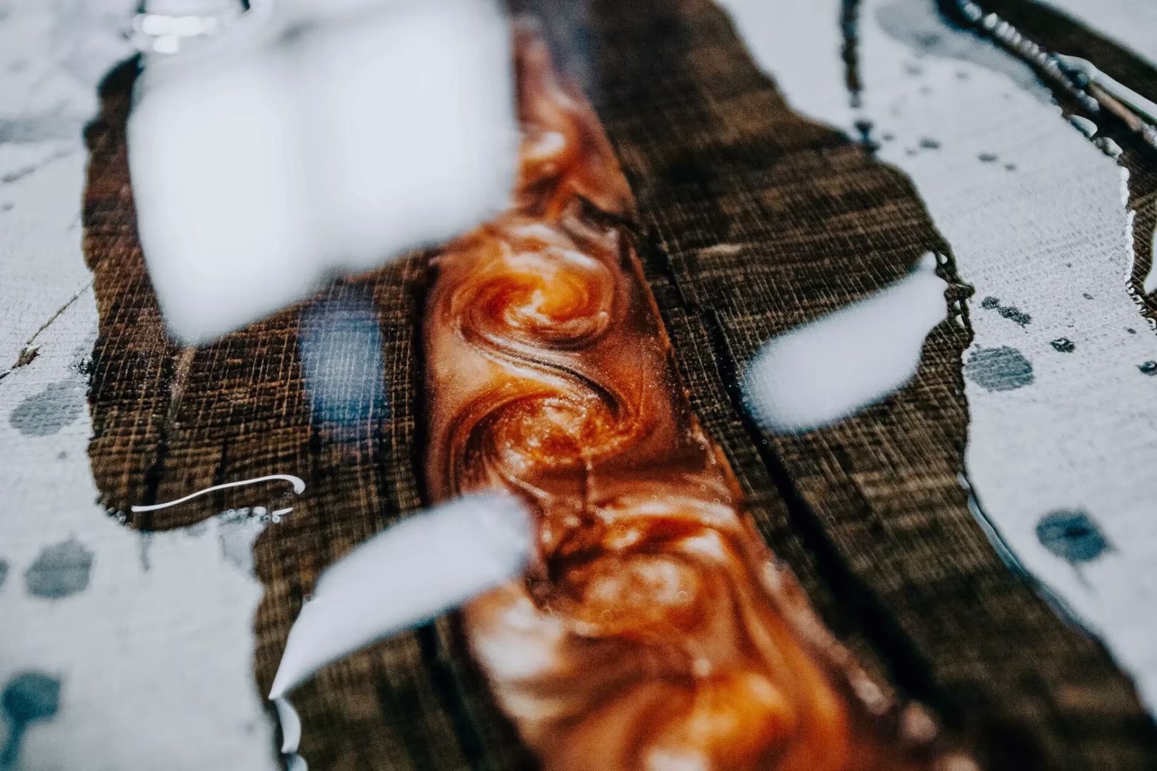 The addition of epoxy to a natural slab is breathtaking! Epoxy is a resin that mimics the appearance of glass without being fragile. The Amish pour the epoxy and let it sit for about three days until it is fully cured as pictured above. A variety of finishes are available including colors, river rock accents, and even clear epoxy.