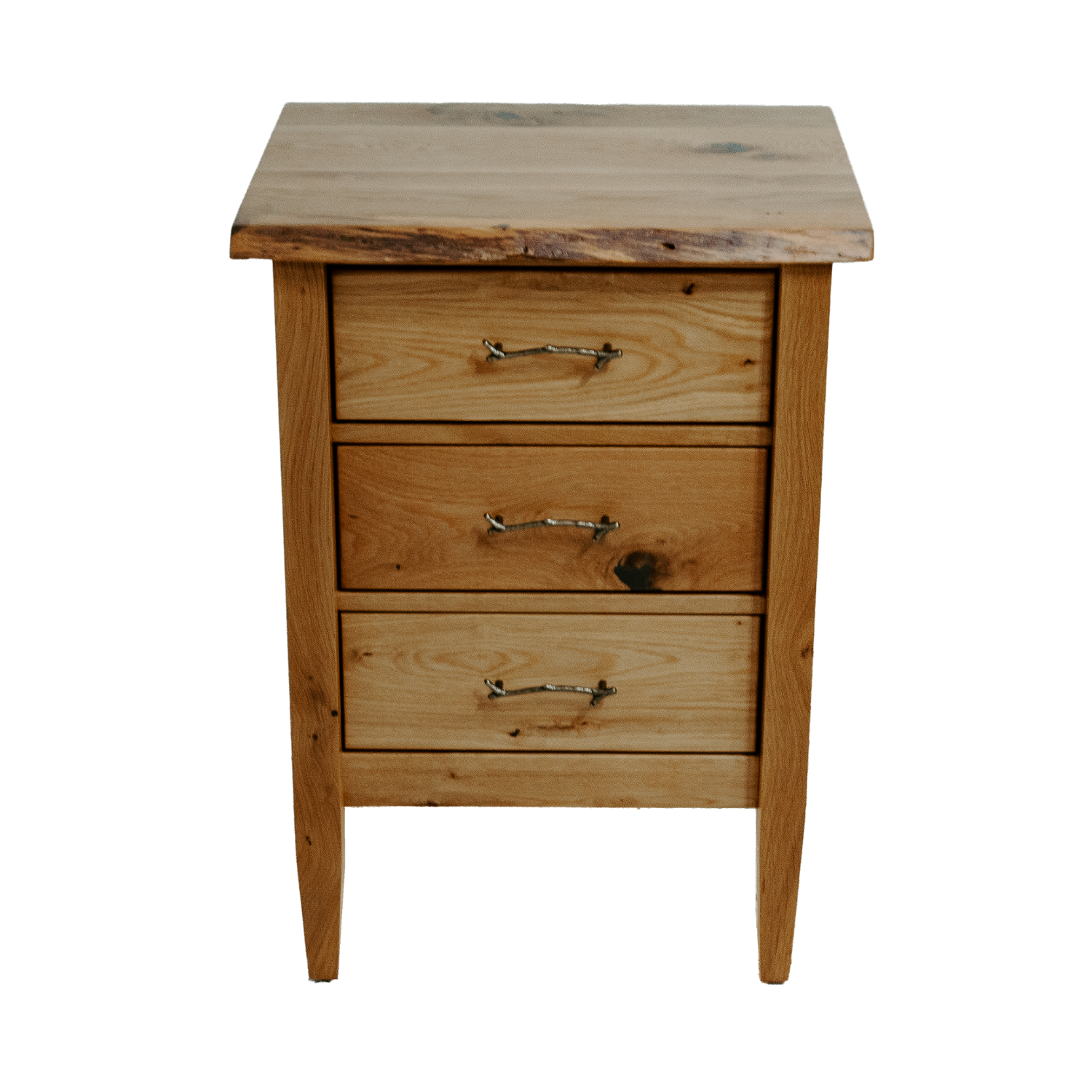 Elevate your bedroom with the timeless beauty of our Amish-made live edge white oak nightstand. Meticulously handcrafted, it exudes rustic charm and organic elegance, with the live edge design showcasing nature's artistry. This nightstand's white oak construction ensures enduring durability, making it a functional and exquisite addition to your sleep space.