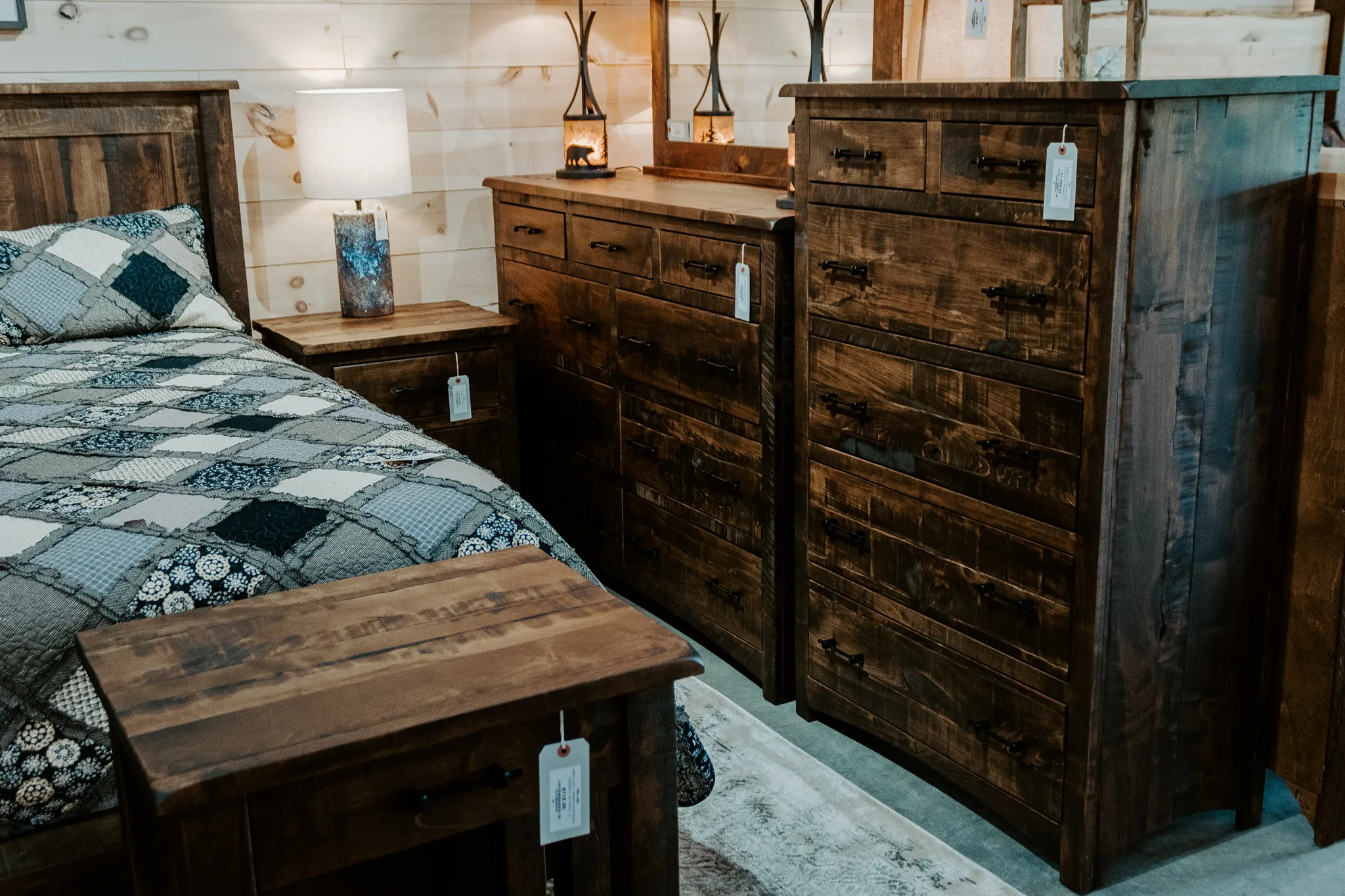 An extra modern feature of this rustic bedroom suite is its state-of-the-art nightstand. This unique rustic nightstand includes dimmable lighting as well as hidden locked drawers for your valuables! Choose from a queen or king size bed and complete your bedroom set with a dresser, chest, and/or nightstands for your Blue Ridge Mountain home.