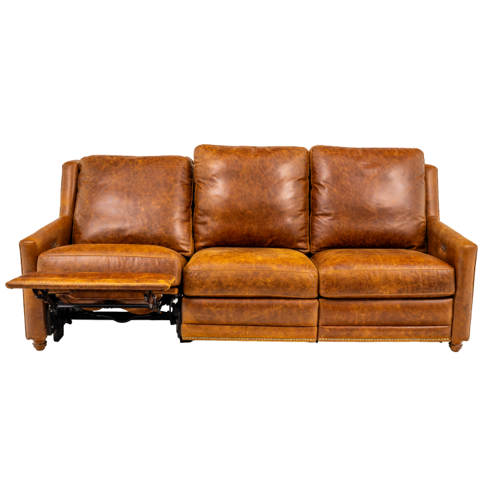This sofa features both a power reclining mechanism and extremely comfortable cushions! The Worden Ranch Collection is made in the USA using solid wood frames and 100% top grain leather all over the piece. You can customize the piece by selecting from a variety of arm styles and nail head finishes!